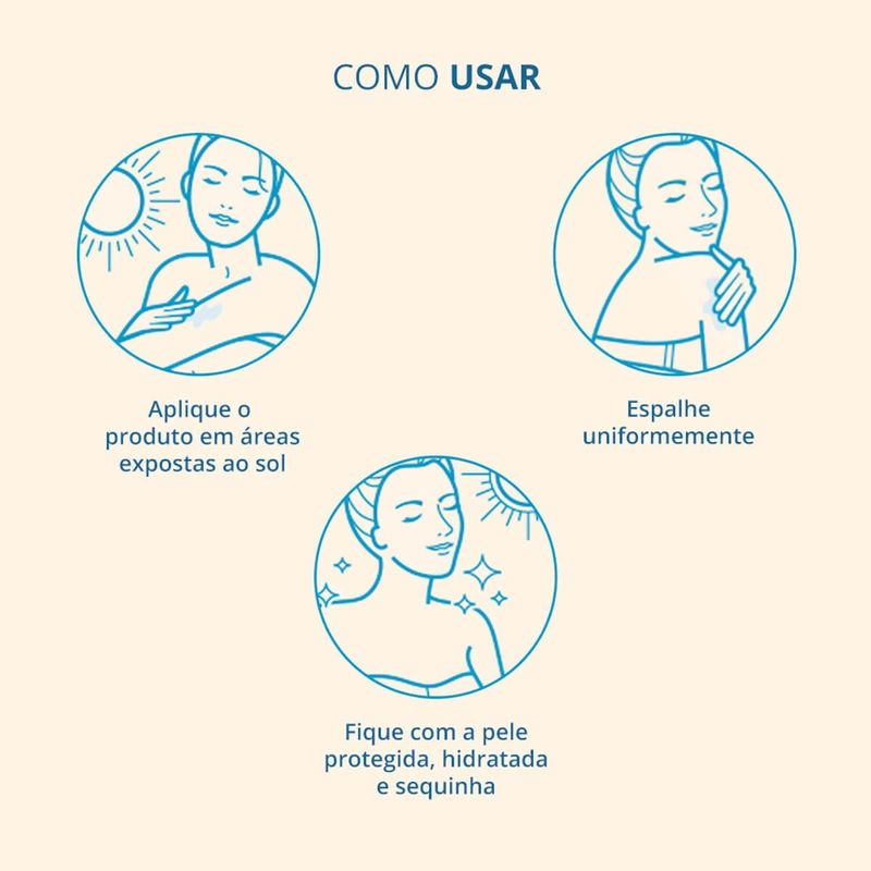 Modo de usar: aplique generosamente sobre a pele seca, 15 minutos antes de se expor ao sol e sempre que necessário. Reaplique após nadar, secar-se com toalha, suor intenso ou tempo de exposição prolongado ao sol.
