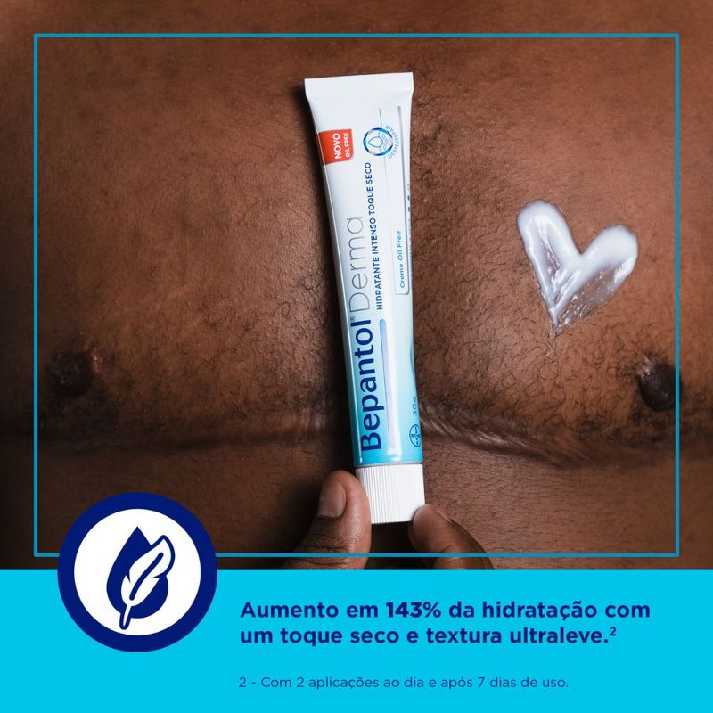 O Bepantol Derma Hidratante Intenso Toque Seco Oil Free de 30g é um hidratante facial que combina uma hidratação intensa com um acabamento toque seco e sem oleosidade. Sua fórmula contém dexpantenol (pró-vitamina B5), que ajuda a reparar a barreira protetora da pele e a aumentar a capacidade de retenção de água. É oil-free, ou seja, não obstrui os poros e é indicado para todos os tipos de pele. Com textura leve e de rápida absorção, pode ser usado diariamente antes da maquiagem ou como parte da sua rotina de cuidados com a pele.