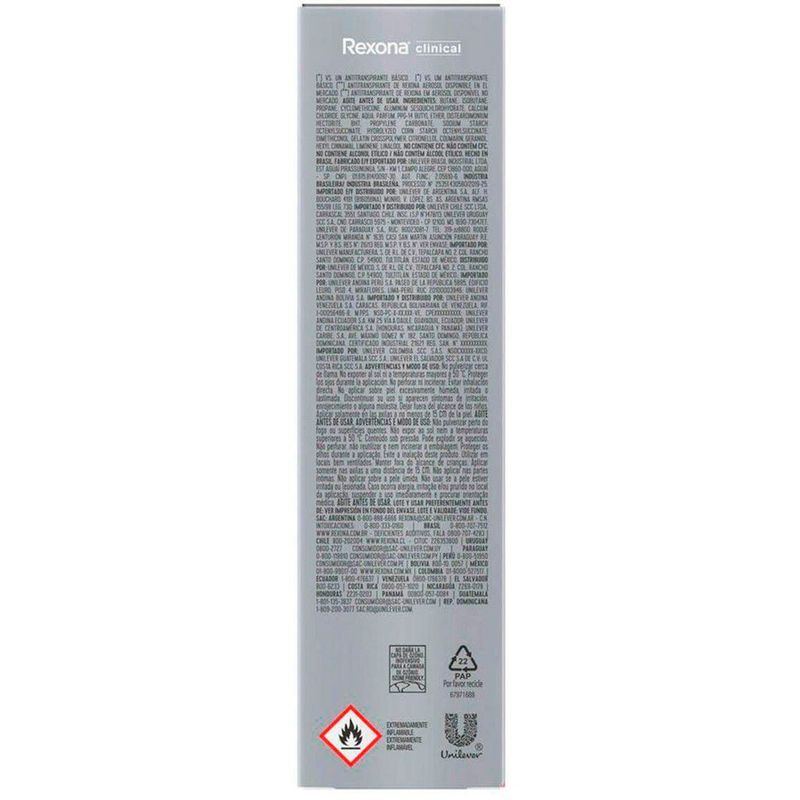 Apresenta diversos benefícios como antimanchas, antibacterial, sem perfume, refrescância, além de uma grande variedade fragrâncias. Os produtos Rexona permitem você fazer mais, sem se preocupar com a transpiração. A transpiração e o mau odor podem ser um empecilho na vida de muitas pessoas, o sentimento de desconforto toma conta nessas situações. O desodorante Antitranspirante Aerosol Rexona Clinical possui a inovadora e exclusiva tecnologia que oferece 3x mais proteção do que os antitranspirantes comuns. Durabilidade de 96 horas contra suor e mau odor. Formulado para combater a transpiração intensa e se sentir seguro durante todo o dia.