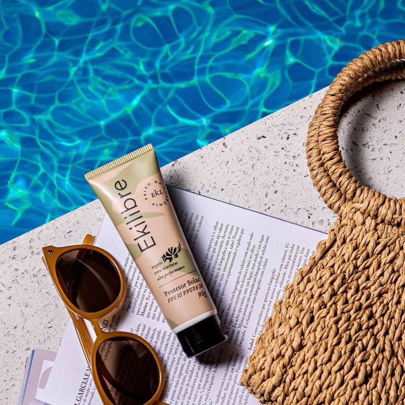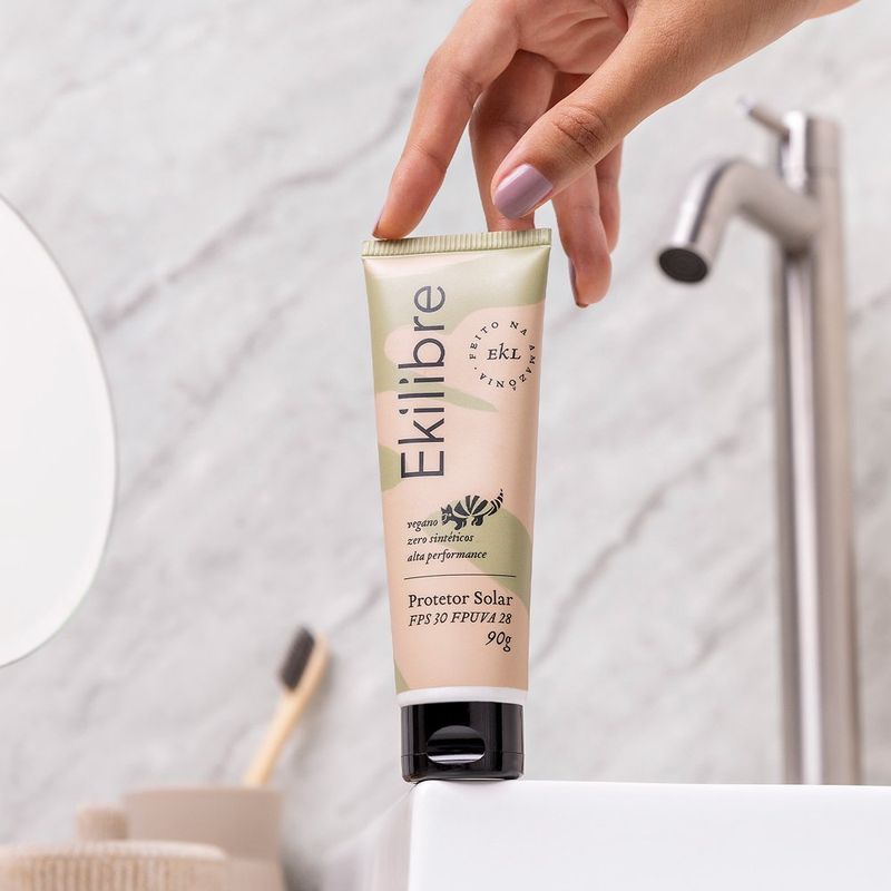O protetor solar vegano Ekilibre é formulado sem fragrância sintética, garantindo uma experiência mais natural, ideal para peles sensíveis.
